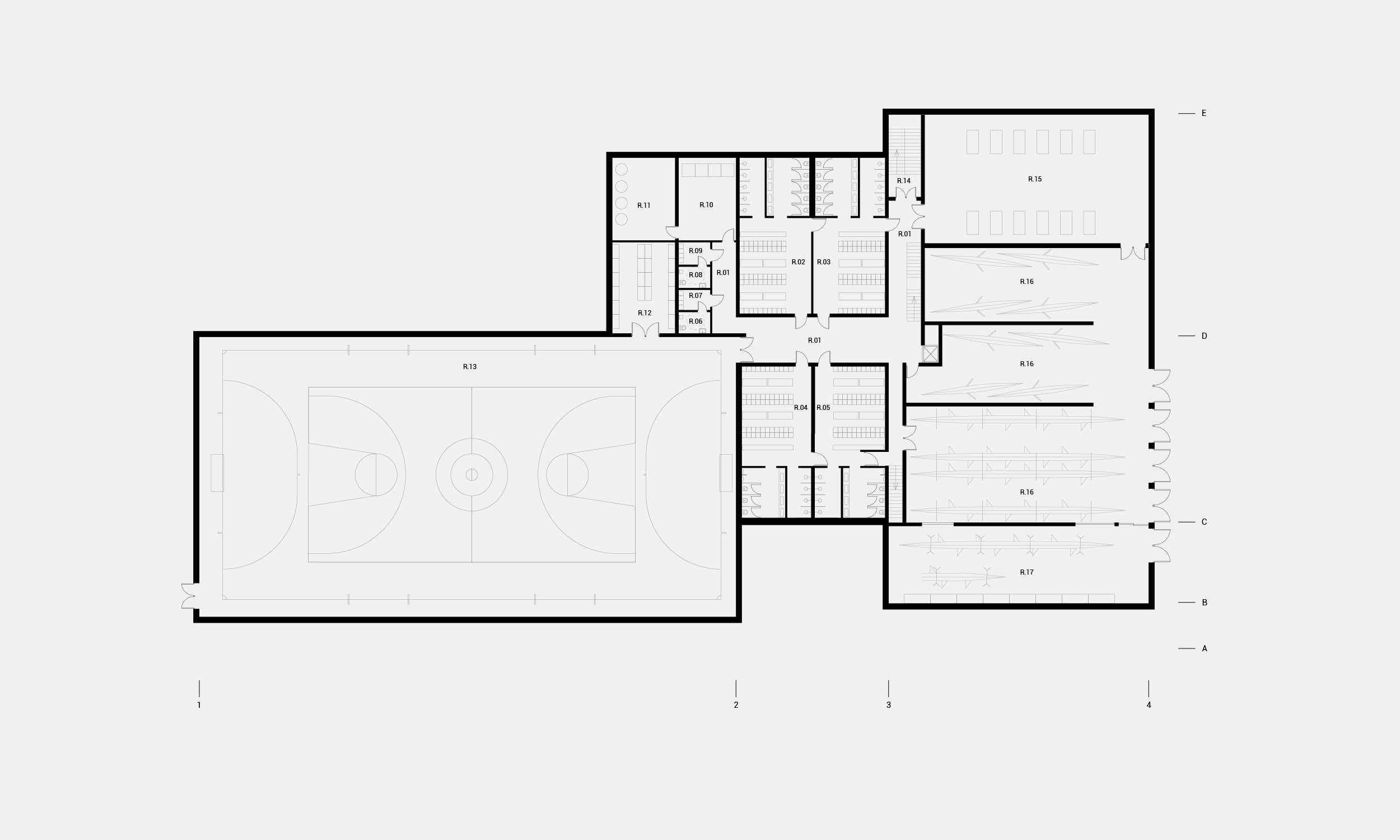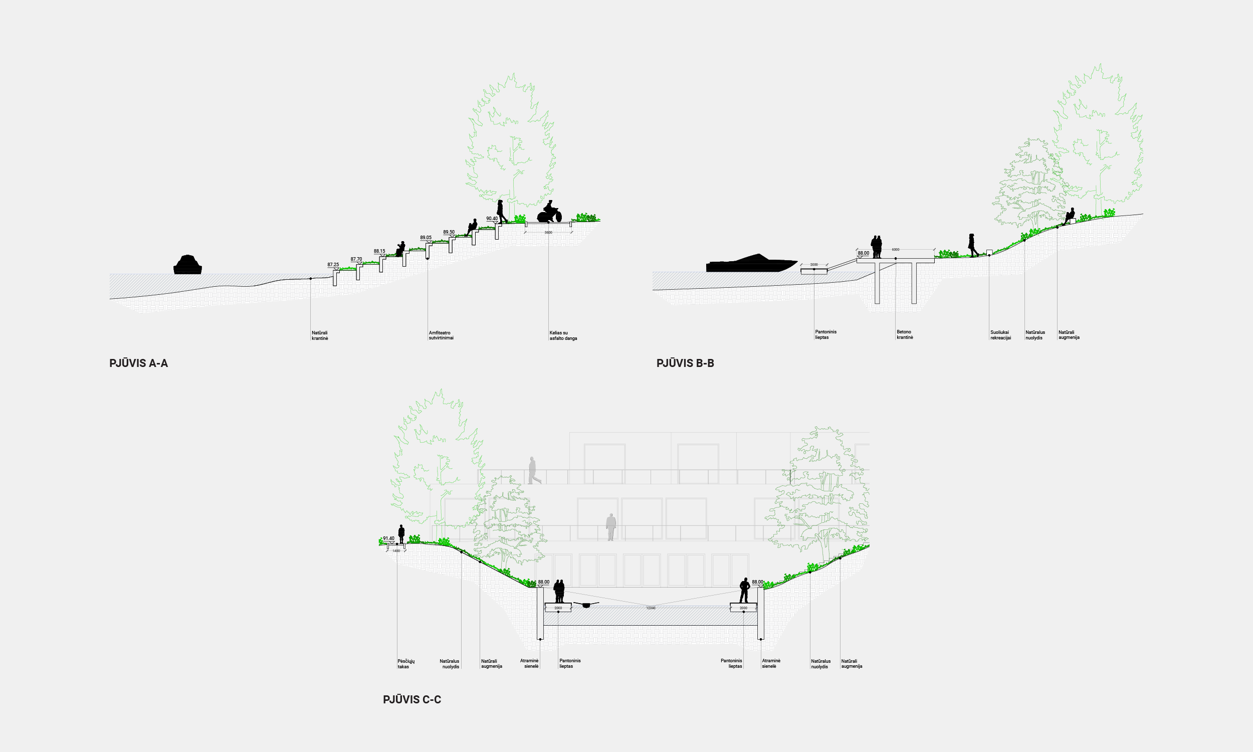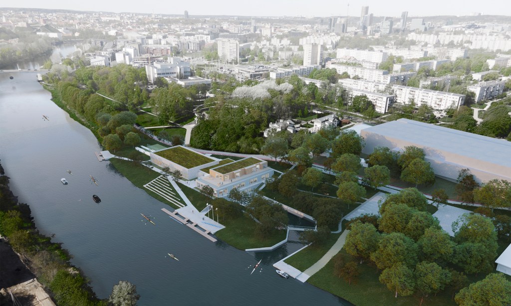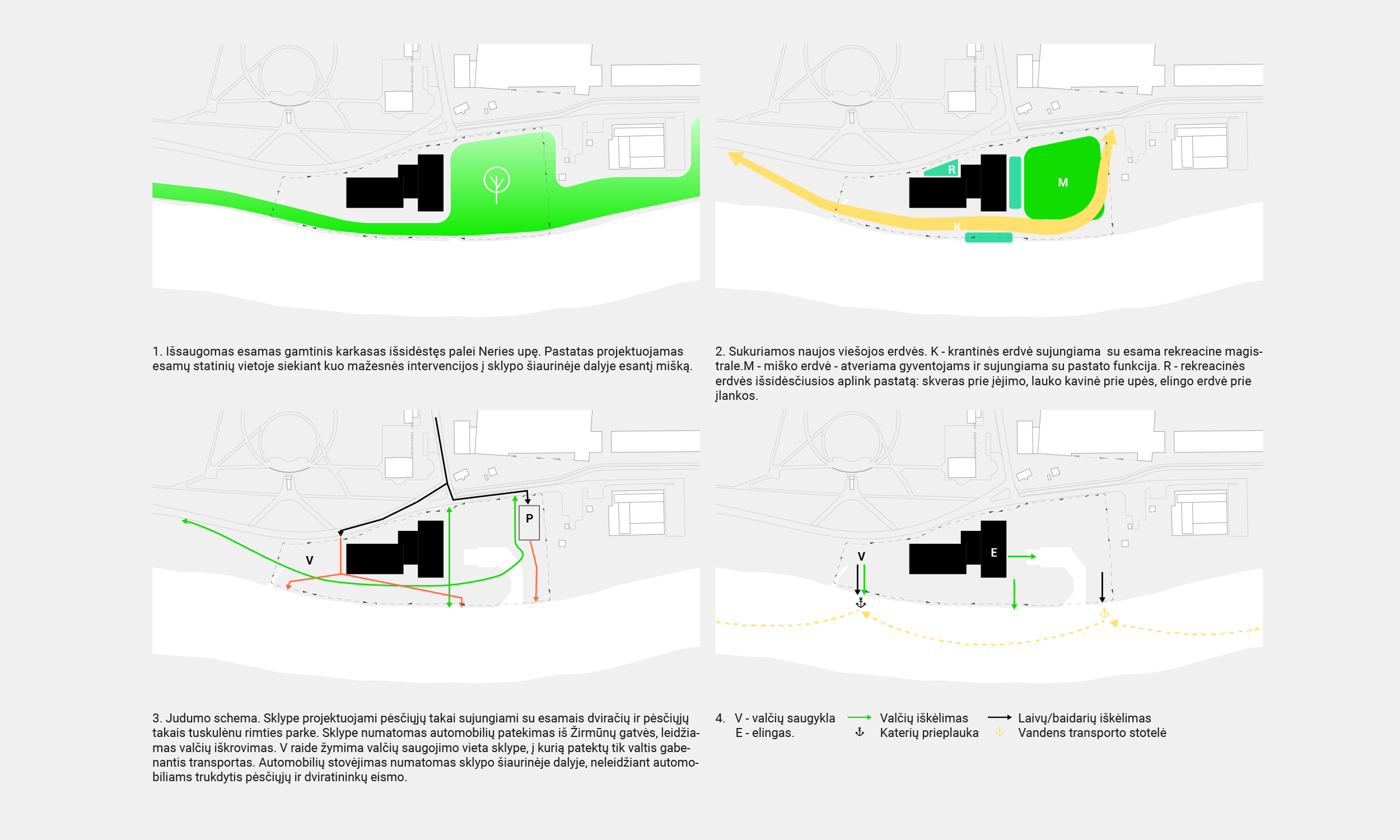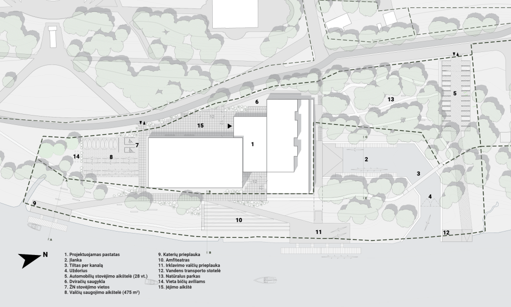 Aplink pastatą ir palei krantinę kuriamos naujos viešos erdvės: aikštė priešais pagrindinį pastato įėjimą, amfiteatras palei upę, jungtis tarp pastato ir įlankos. Aktualizuojamas esamas vertingas medžių masyvas – kuriamas natūralus parkas, jungiamas su pastato funkcija. Krantinės erdvė pėsčiųjų takais sujungiama su rekreacine miesto magistrale. Visa tai sklandžiai įlieja pastatą į esamą miesto rekreacinę sistemą ir kuria gyvas, atviras erdves miestiečių poilsiui ir sportui.