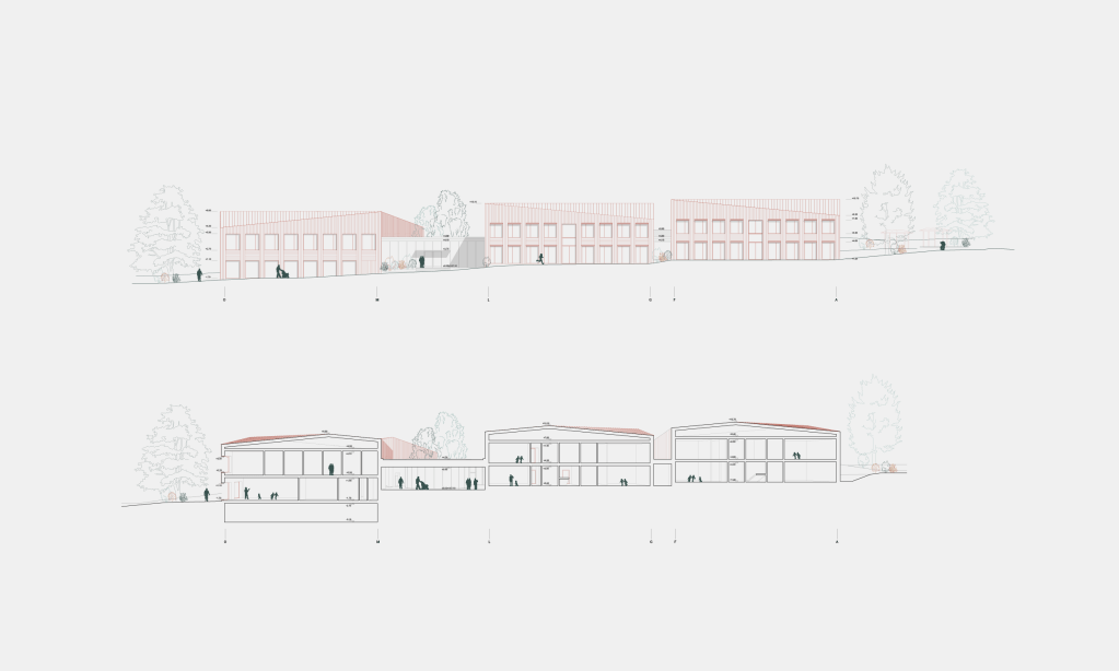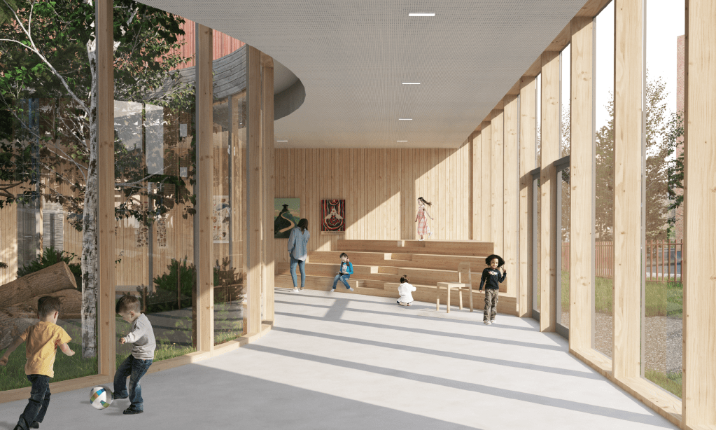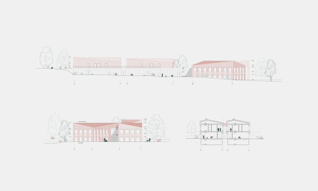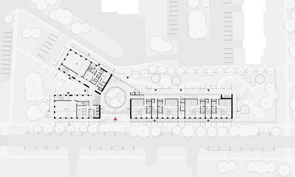 Pastato architektūrinė idėja – tarpusavyje sukirsti stačiakampiai tūriai, kurių centre integruojama esama medžių grupė. Ši medžio grupė tampa įėjimo akcentu ir pabrėžia pastato artumą su gamta. Susikertantys tūriai išsišakoja nuo pagrindinio įėjimo į šiaurės, pietų ir šiaurės rytų kryptis, taip reaguodami į sklypo formą ir kvartalo užstatymą. Susikertančių tūrių kampuose suformuojamos pusiau uždaros erdvės įgauną skirtingas funkcijas. Pastato tūriai suskaidomi į mažesnes dalis siekiant sklandžiau įveikti sklype esantį šlaitą ir sumažinti pastato mastelį priartinant jį prie darželio funkcijai būdingo dydžio.
